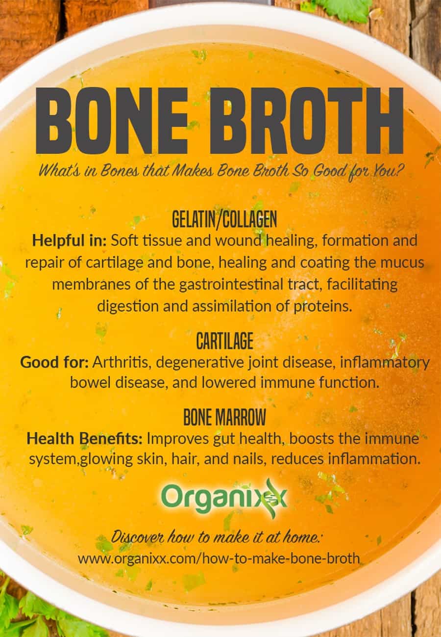Benefits of bone broth come from collagen, cartilage, and bone marrow.